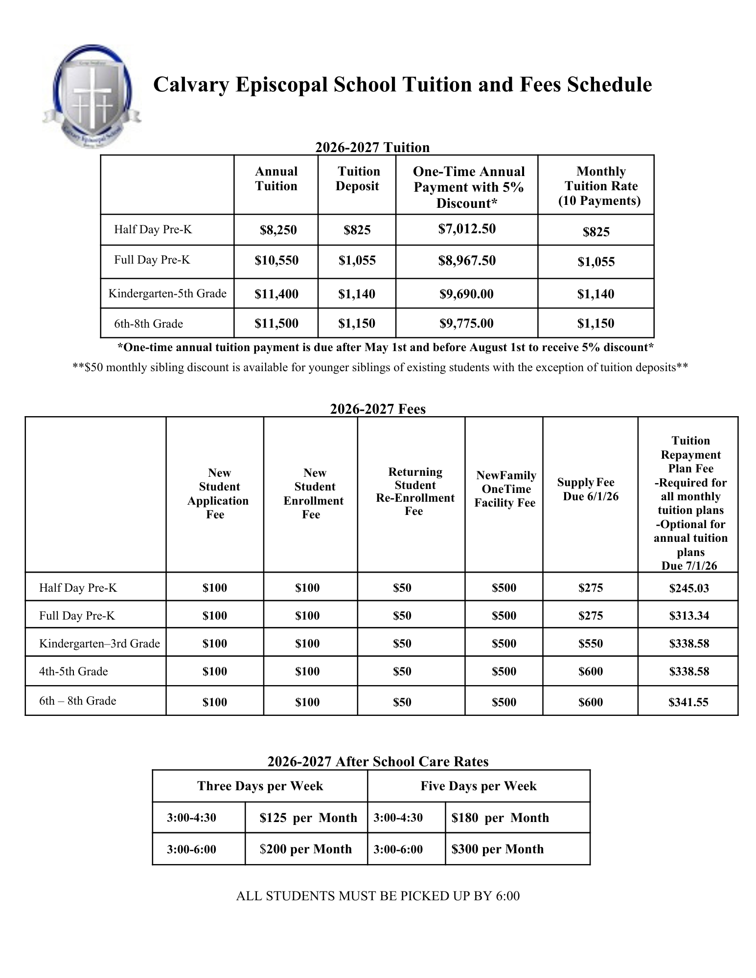 2026-2027 Tuition and Fee Schedule
